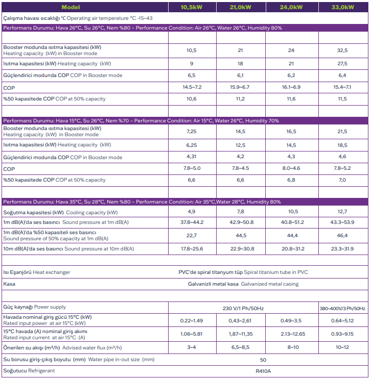 • Yüzme havuzu ısı pompası aralığı 10,5 KW ila 126 KW